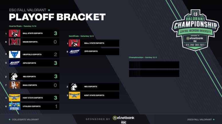 It’s finally time for the ESC Fall VALORANT Championship hosted at Central Michigan University and presented by Nelnet Bank! The final four teams have traveled to Mount Pleasant, Michigan to be crowned the 2023-24 champion. With Buffalo losing in the quarter finals we are guaranteed a new victor, now let’s take a look at the four teams vying to lift the coveted trophy.