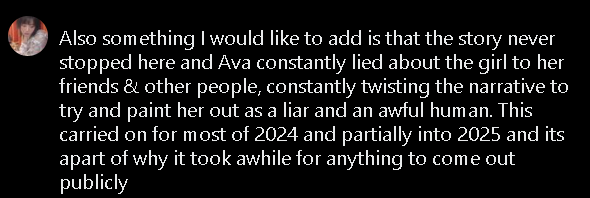 Shortly after, another victim spoke up: Ashe. She posted a document stating how flor asked Ashe to “groom her,” accompanied by eight pages of screenshots involving said reprehensible behavior.
