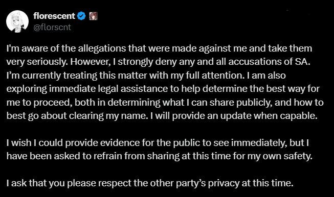 About 12 hours after the first doc was posted, florescent put out a short statement on X.