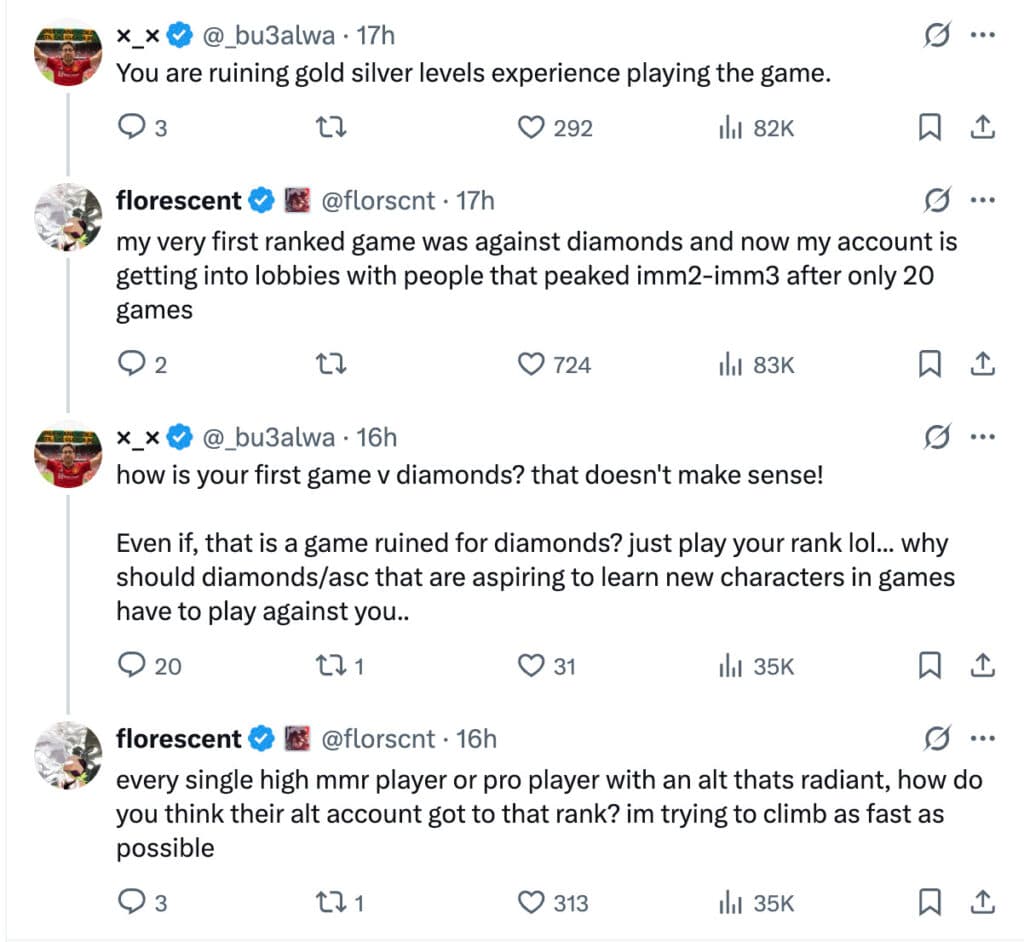 "My very first ranked game was against Diamonds and now my account is getting into lobbies with people that peaked Immortal 2-3 after only 20 games," said florescent in the replies.