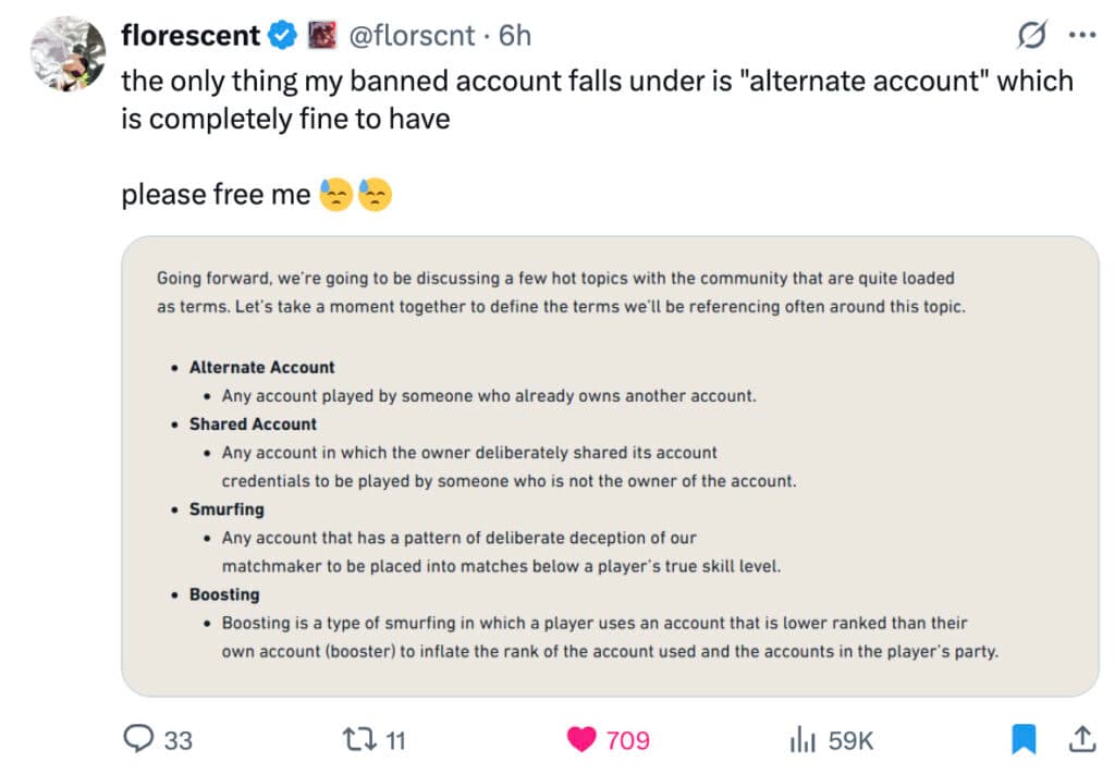For now, Riot seems unmoved and community sentiment shows little sympathy for unbanning alt accounts. At time of writing, florescent's alt account remains suspended.