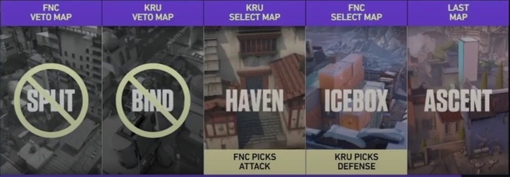 Nothing is entirely different about the pick and ban phase in the maps. Fnatic defaulted to once again banning Split. The Split ban for Fnatic is one that is a staple in every Fnatic matchup. The European team does not like playing on Split and will continue to avoid playing there if they can. As a result, Kru Esports followed by banning Bind in the first match of VCT Masters Reykjavik. As a result, Kru go on to pick Haven as Fnatic pick