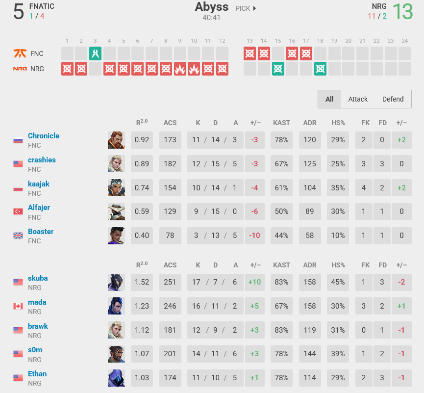 The most recent head-to-head record between Fnatic and NRG is their match at VALORANT Masters Tokyo 2023. Back then, Fnatic won with a confident 2:0, including a pretty disastrous 13:4 for NRG on Bind.