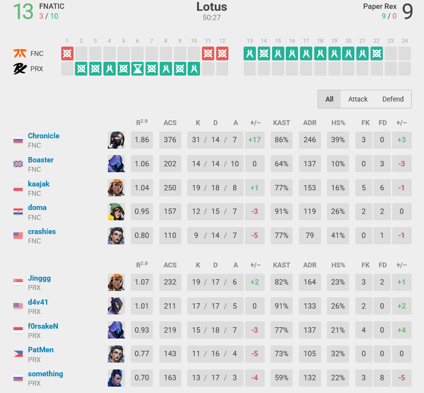Paper Rex won the pistols, but everything fell apart in the next round. FNC won their eco buy to be back in the game. Thanks to d4v41’s clutch with 3K, PRX secured two more rounds — before FNC went absolutely nuts with kills and general map domination.