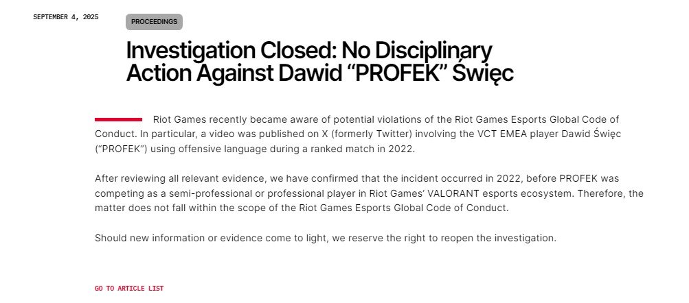 On Sept. 4, the player shared the official conclusion to the investigation. Since the incident occurred when PROFEK was competing “as a semi-professional or professional player in Riot Games’ VALORANT esports ecosystem,” it does not fall within the “scope of the Riot Games Esports Global Code of Conduct.”