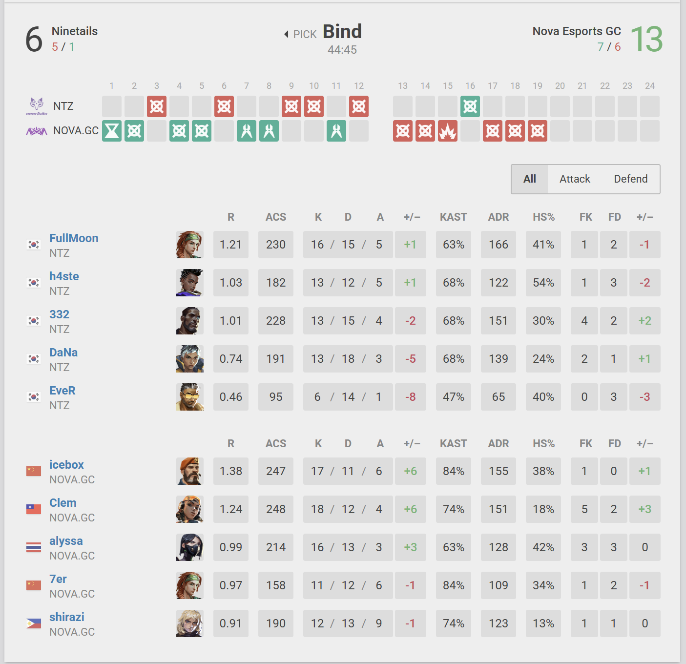 Map 1 was a solid game for NOVA. Even though Bind was NTZ's pick, NOVA took control of the map and did not give their South Korean adversaries any room to get ahead. The first half was a close 7-5 in NOVA's favor, but the second half was undeniably the Chinese team's as they closed out the game 13-6. NOVA looked unstoppable with Wang "Clem" Ke-ching leading the charge for the squad. This win also marks the first map win of a Chinese squad at any GCC event.
