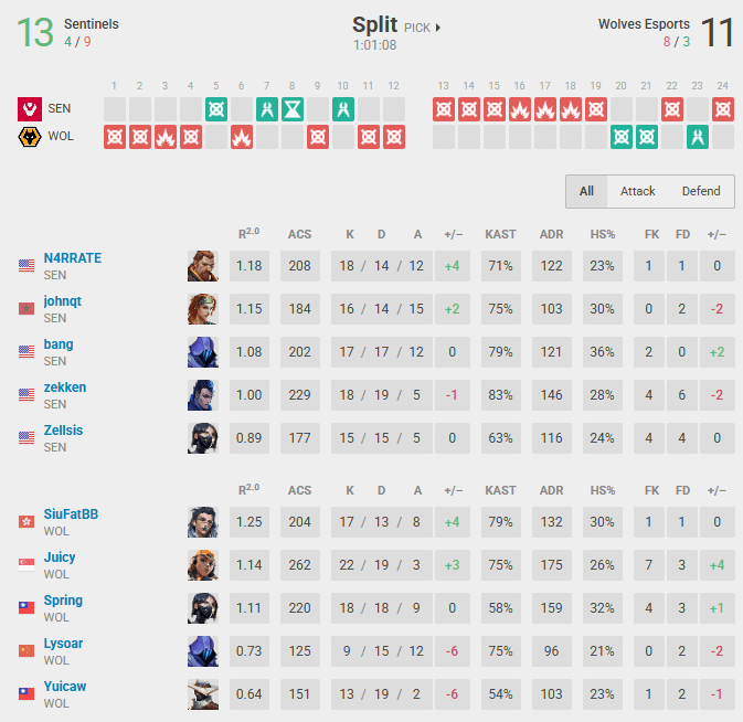 Teams Map 1: Split Map 2: Lotus Map 3: Icebox | SEN vs WOL 13-11 13-8 - |
