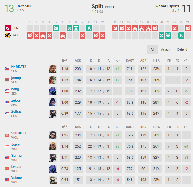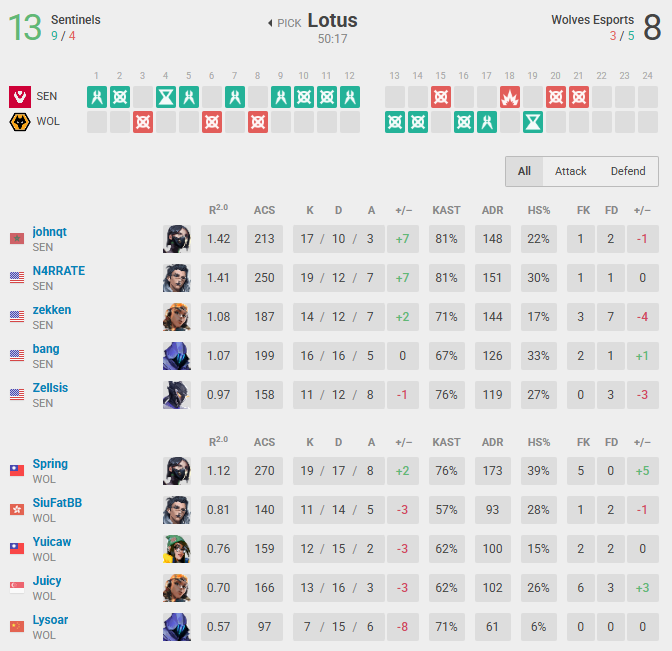 This time, Sentinels started strong, having control of the game very early. They were confident and dominant, but Wolves Esports was starting to get back on track slowly in the second half. Bang and Spring (both playing in the controller role) were carrying their teams, being very impactful on the map.
