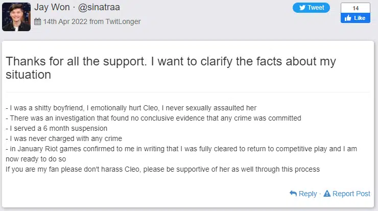After Riot’s investigation ended with no definitive conclusion, the game developers left the case to appropriate law enforcement. However, there has been no further information on the allegations since then. Although Riot lifted the ban in September, the player only confirmed his return two days ago. His statement comes after several persons in the esports community expressed concerns about his return to the competitive stage.