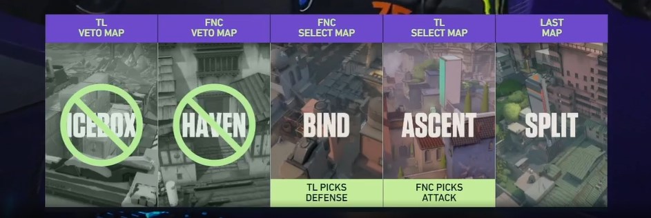 Just as Fnatic started to pull away from Team Liquid (at 10-7), there was another Liquid tactical timeout. Unfortunately, this time around, the timeout was not enough as Jake “Boaster” Howlett and teammates continued to wreak havoc on Bind. The final round saw Fnatic pull off a near improbable win to secure Map 1 as the players showed their synergy and coordination to eliminate all TL players. Fnatic won Map 1 with a 13-10 score and the two teams headed to Team Liquid’s map pick of Ascent.