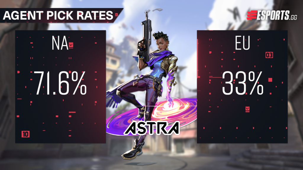 These differences are indicative of vastly different playstyles. EMEA teams embrace the utility of different controllers or sentinels to create complex plays, layering forms of crowd control. NA teams tend to prefer Astra because she provides a singular solution. In the right hands, Astra is capable of locking down a map by herself.