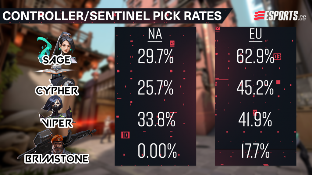 European teams such as the top seeded Team Liquid tend to prefer other adjacent Controllers and Sentinels, and typically have a greater amount of them in a single composition. The pick rates of Sage (62.9%) in EMEA eclipse that of NA while Viper (41.9%) and Cypher (45.2%) also hold healthy leads.