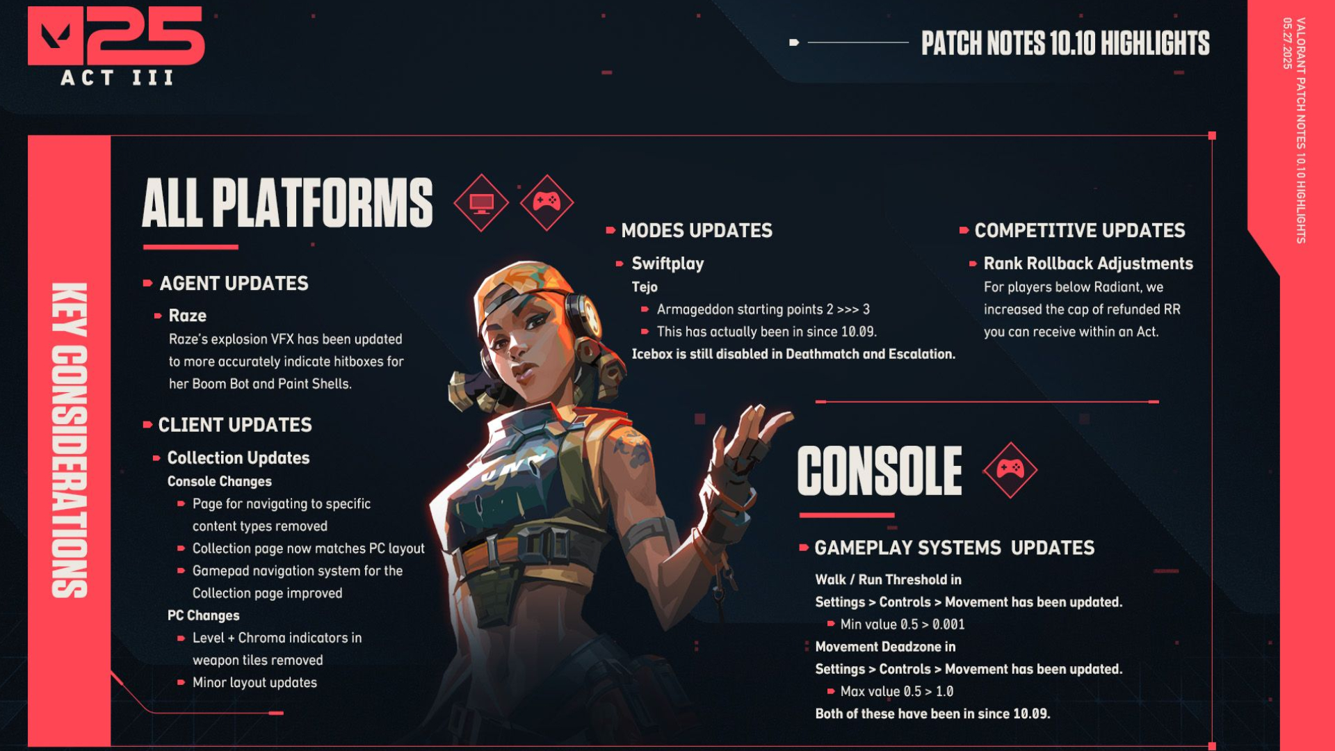 The VALORANT 10.10 patch notes are now live in-game. Discover the latest Raze VFX update, rank rollback adjustments, and more.