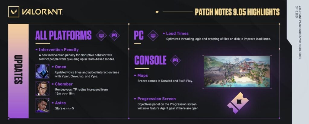 As it has been since the game released on console, the VALORANT patch notes for 9.05 are broken down into three sections. Below, you’ll find all three, with changes to all platforms, only PC, and only console.