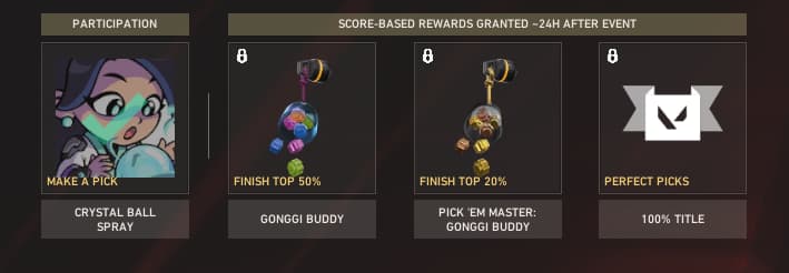 As previously mentioned, the first edition of VALORANT Pick’Ems is for Champions Seoul. On the main page of the Pick’Ems section, you’ll see the available rewards. Those are: