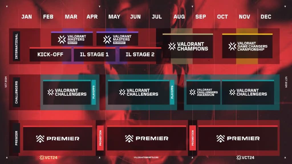Riot Games gave us our first look at the VCT 2024 calendar in August, during Champions 2023. They let us know about the VCT 2024 kick-off tournaments, the league splits, the Masters tournaments, and a rough estimate of when the year’s championship event will take place.