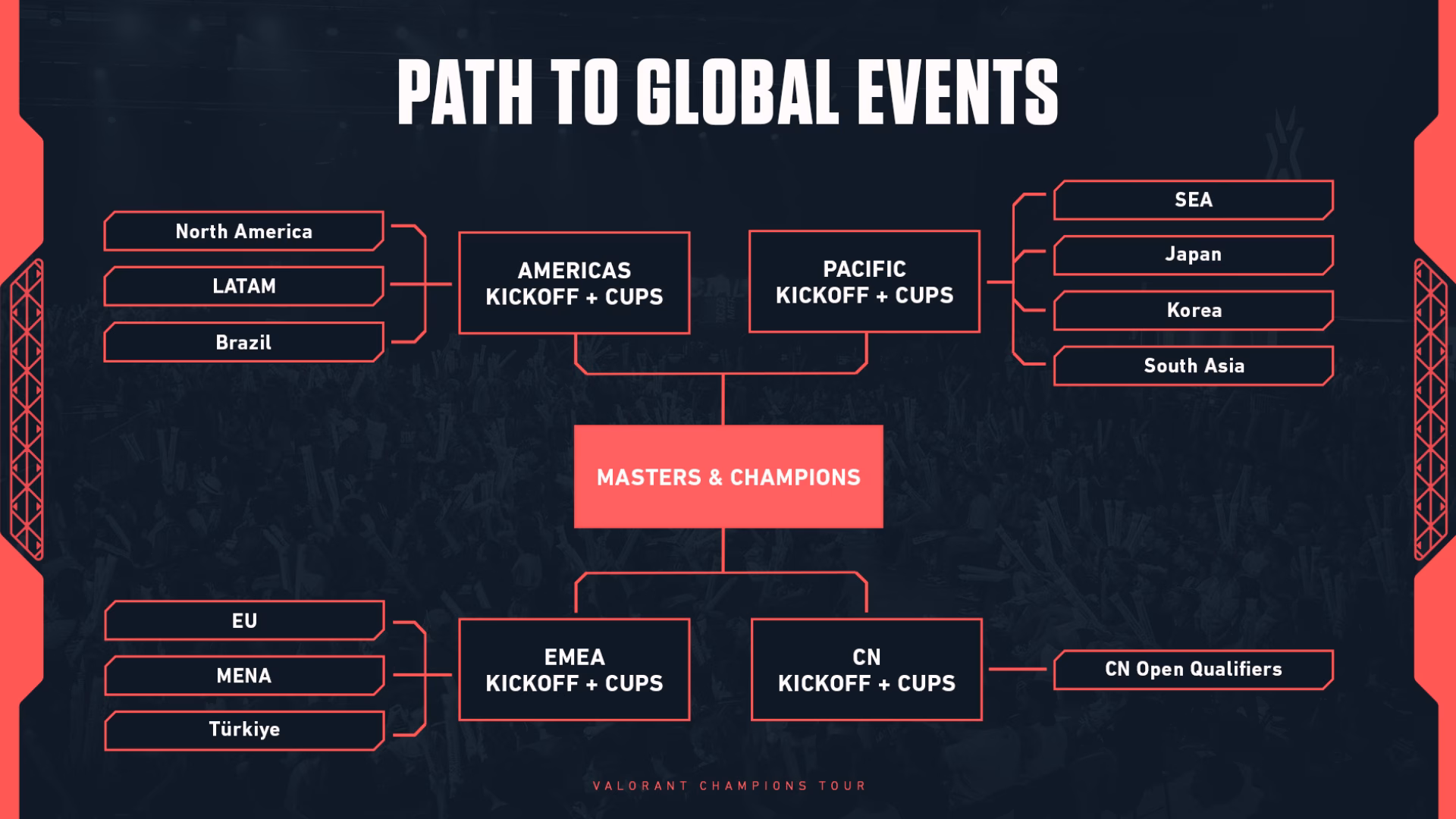 Teams will then advance to the regional tournaments, including Kickoff and the most recent Cups. These LAN events will replace the traditional league play and determine the best teams of each region. The top teams will qualify for the Masters and Champions. The LAN events will also be hosting live finals in different cities. In total, the VCT will host over 20 tournaments across more than 16 cities.