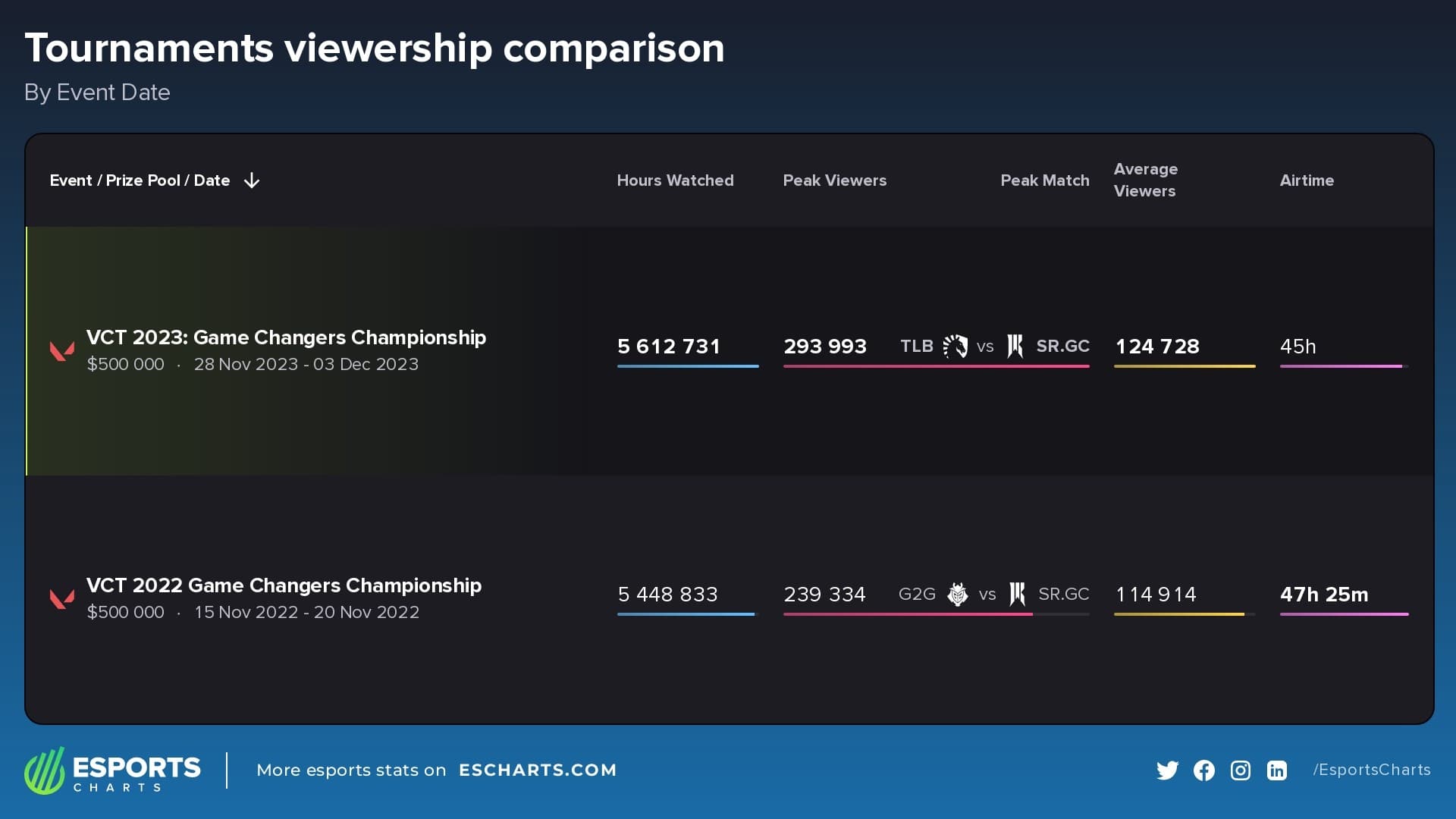 In addition to the total number of Game Changers viewers, Esports Charts reports several other key metric improvements. Compared to 2022, the 2023 tournament saw nearly 200,000 more hours watched and 10,000 more average viewers with two-and-a-half hours of less airtime.