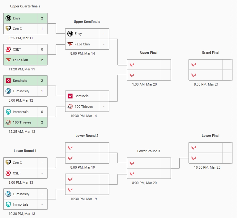 For Faze Clan their semi-final encounter with Team Envy will be their first real challenge. Faze Clan breezed past XSET in the quarter-finals winning 13-6 and 13-3. In comparison Team Envy, who were heavy favourites for their match versus Gen.G Esports, had a close call. After going one a piece over the first two maps, Team Envy and Gen.G were tied 9-9 on Bind in game three.