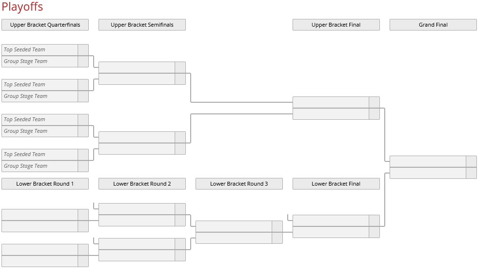 The eight remaining teams will compete in a double-elimination bracket. The bracket will feature the four 1st seeds previously mentioned and the four teams that qualified from the group stage. Each series minus the lower bracket final and the grand final will be a best-of-three. The latter two finals will be a best-of-five.