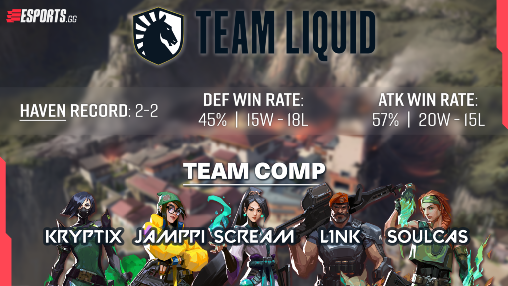Team Liquid played on Haven 4 times during the Champions Tour Stage 2: EMEA Challengers Playoffs, and their winrate is split right down the middle. They have won twice, and lost the same number of times. Team Liquid is going into VCT Masters Reykjavik with a 57% defensive winrate, successfully holding their ground for 20 rounds out of 35.