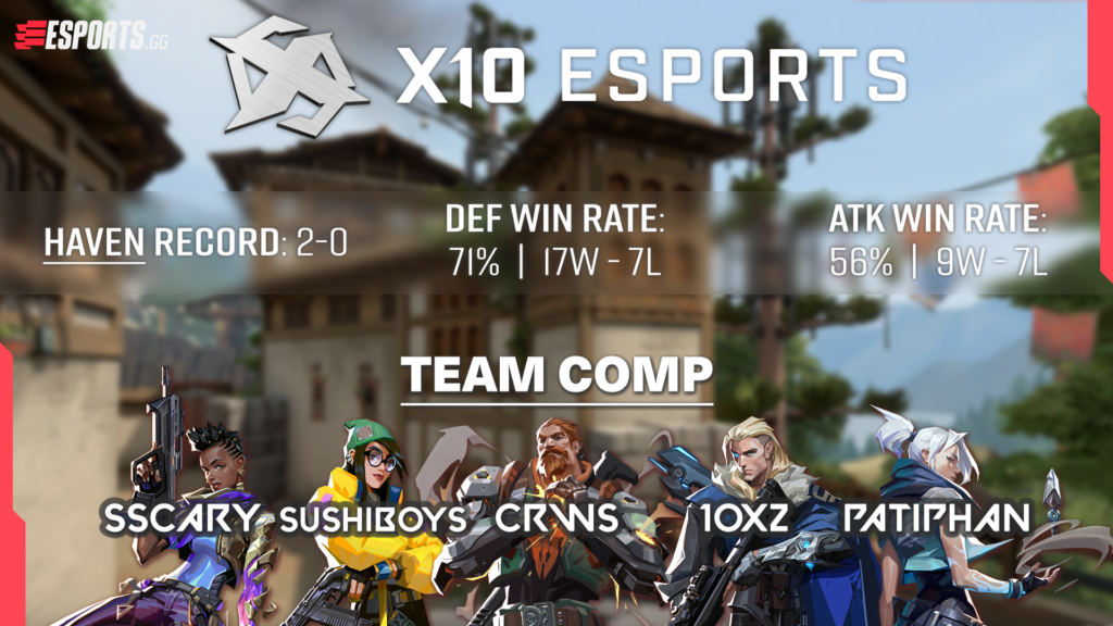 Last but not least, X10 Esports, the Champions Tour SEA Stage 2: Challengers Finals champions. The team were victorious on the two times they played Haven during the tournament. They stuck to one composition during both of them, and can’t say it didn’t work.