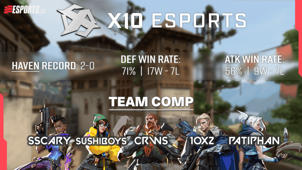 Last but not least, X10 Esports, the Champions Tour SEA Stage 2: Challengers Finals champions. The team were victorious on the two times they played Haven during the tournament. They stuck to one composition during both of them, and can't say it didn't work.