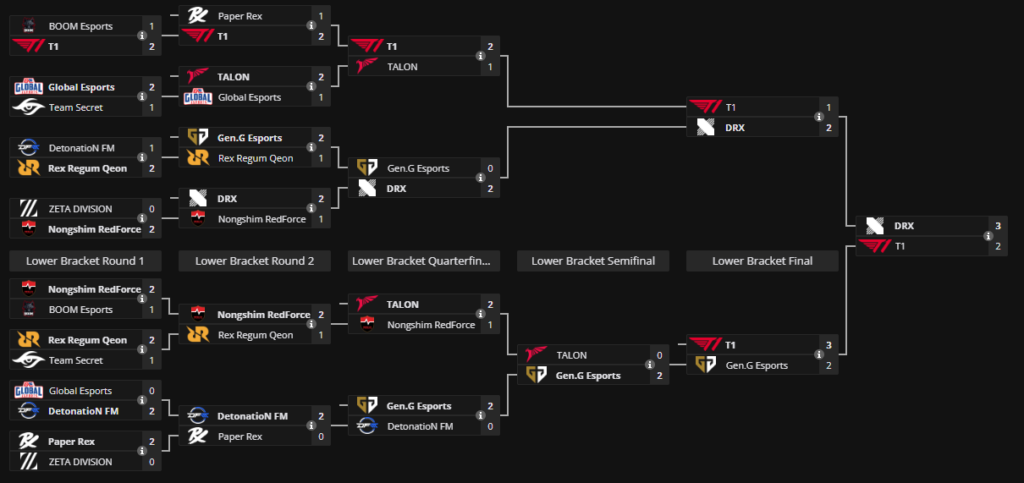 - Upper bracket final. DRX proceeds to grand final, T1 falls to lower bracket final.