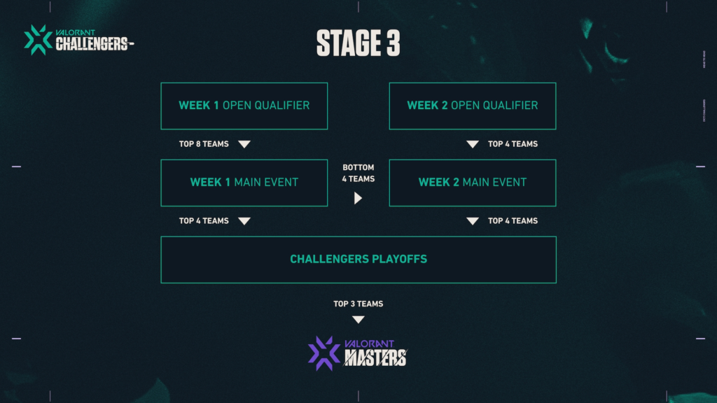 VCT Stage 3 in North America follows nearly the exact same format that Stage 2 did. The stage will have two Challengers events, with open qualifiers seeding teams into them. In Challengers 1, 8 teams will do battle. The top four progress to Challengers Finals, while the bottom four get a bye to Challengers 2.