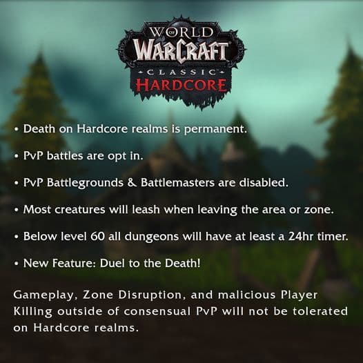 - Gameplay, Zone Disruption, and malicious Player Killing outside of consensual PVP will not be tolerated on Hardcore realms.