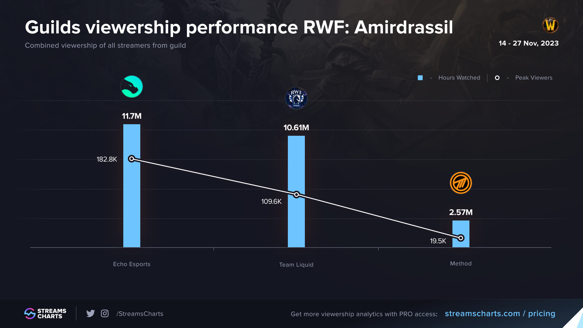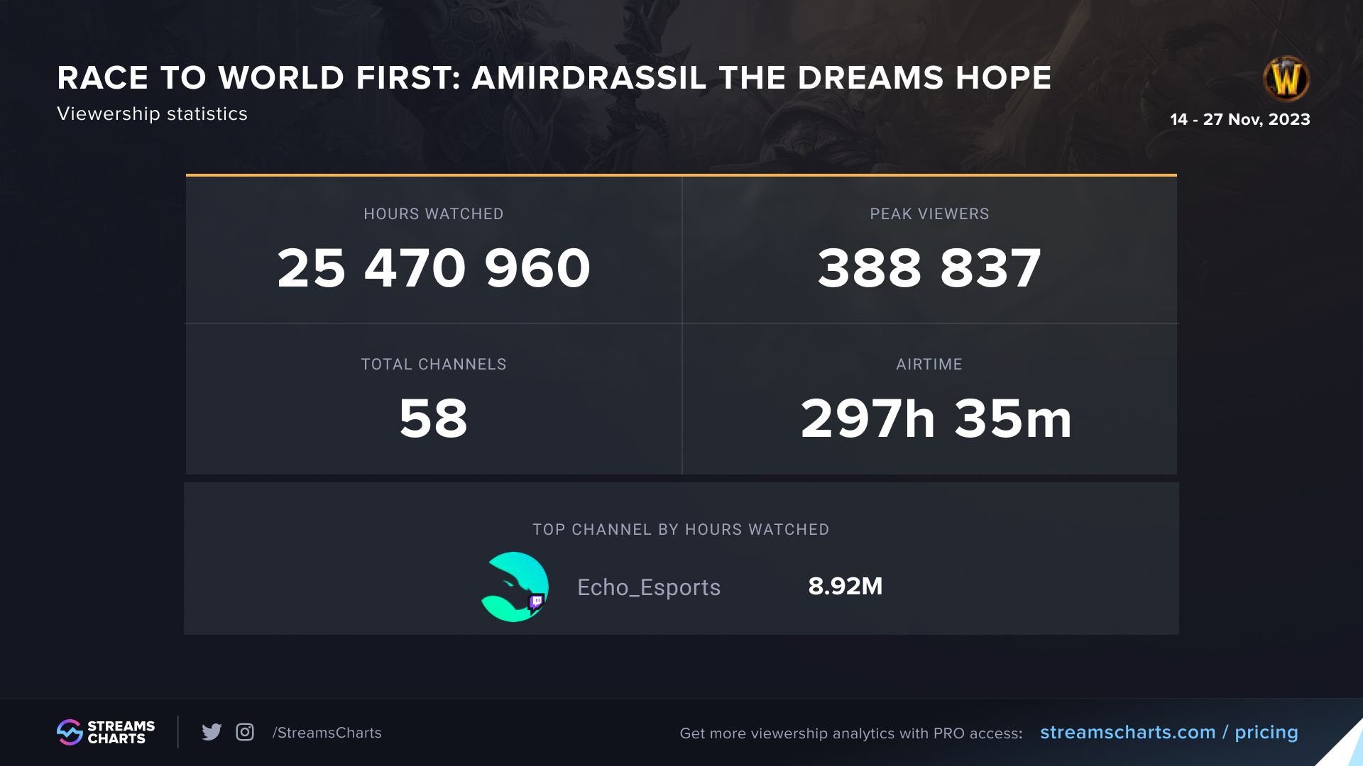 Moreover, the event made World of Warcraft the second most popular and highest viewed game on the streaming platform. With over 300 hours of broadcasting time during the tight raid race, the Amirdrassil RWF brought a collective 25.47 million hours viewed on Twitch.