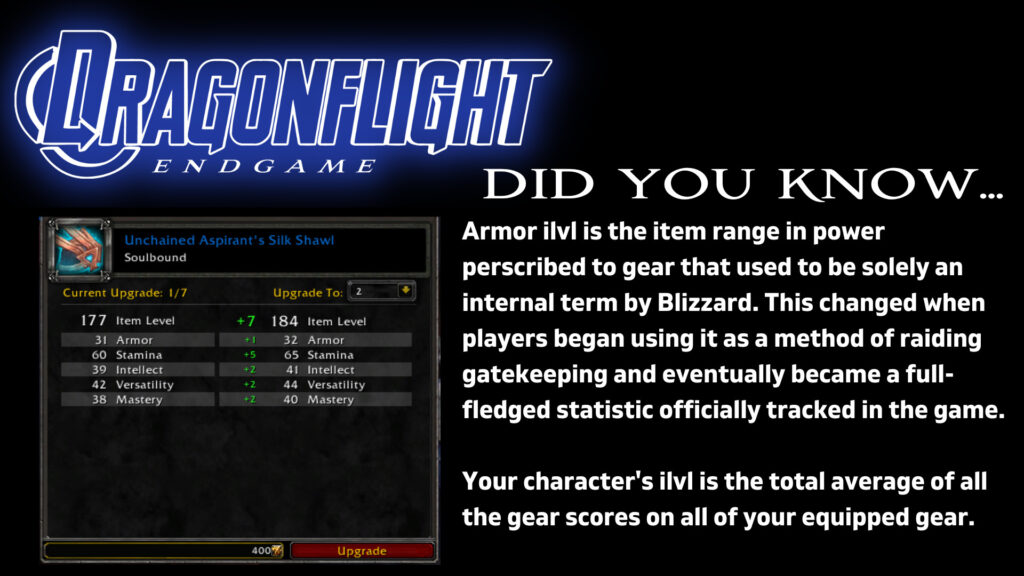 - Helps fill the armor ilvl gaps before hitting max level