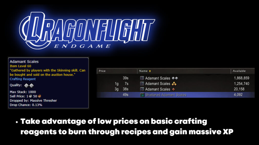 - Take advantage of low Auction House prices to burn through low-level recipes