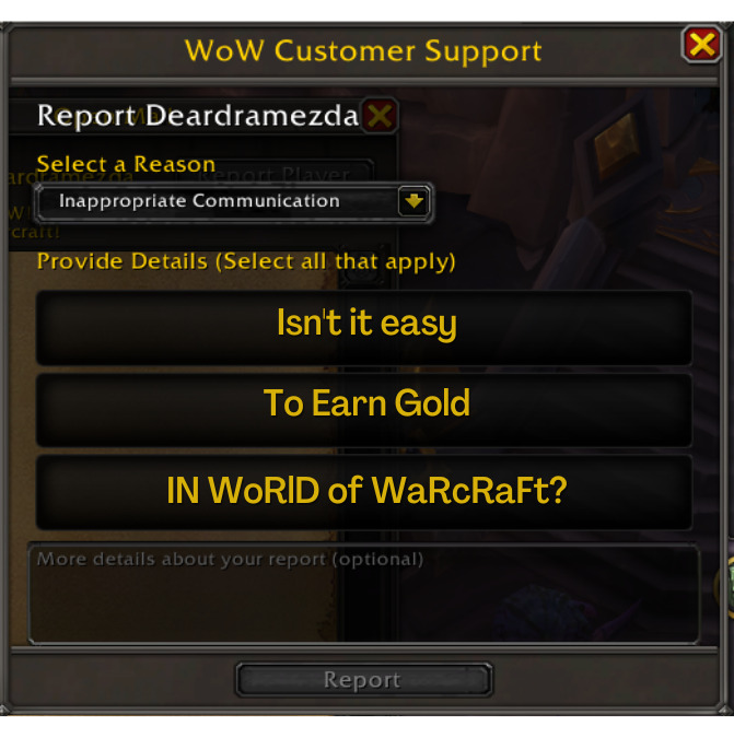 Huh. Um. That’s unusual, and worse yet: There’s only one single gold in there. Maybe this wasn’t the mail you were waiting for. Better report them! After all, a safe Azeroth is a fun Azeroth!