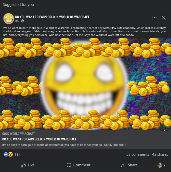 Suggested ads on Facebook are so easy, sometimes it feels like you find the thing you’re looking for before you even thought to look for it! So convenient. Just scroll down through your Facebook feed while saying out loud–preferably near a smart device of your choice–that you want to earn gold in World of Warcraft! It won’t take long, so don’t worry if what you’re looking for isn’t there.