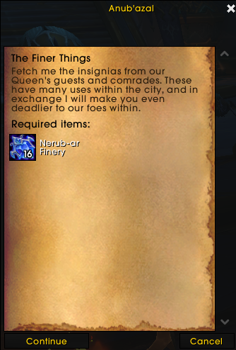 When you arrive at the raid entrance, you’ll find a projection of Anub’azal offering a repeatable turn-in quest called The Finer Things.