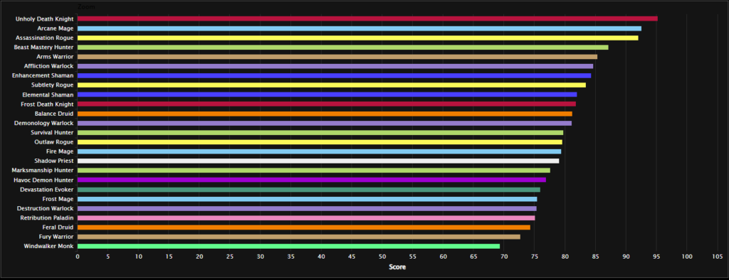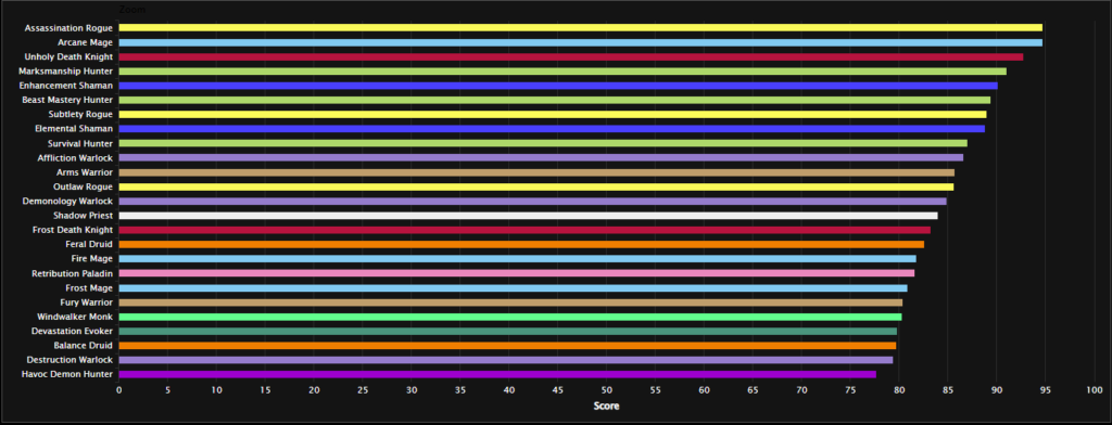 Arcane Mage continues to dominate the numbers, with Unholy DK and Assassination Rogue all far from the best of the pack. Arane sitting atop the list of best DPC specs is no shock, given its high AOE and single-target damage. In addition, the class has strong cleave potential while also possessing better utility than most classes. The same goes for Assassination Rogue and Unholy Death Knight, as both also possesses best-in-class AOE and persistent damage-over-time effects.