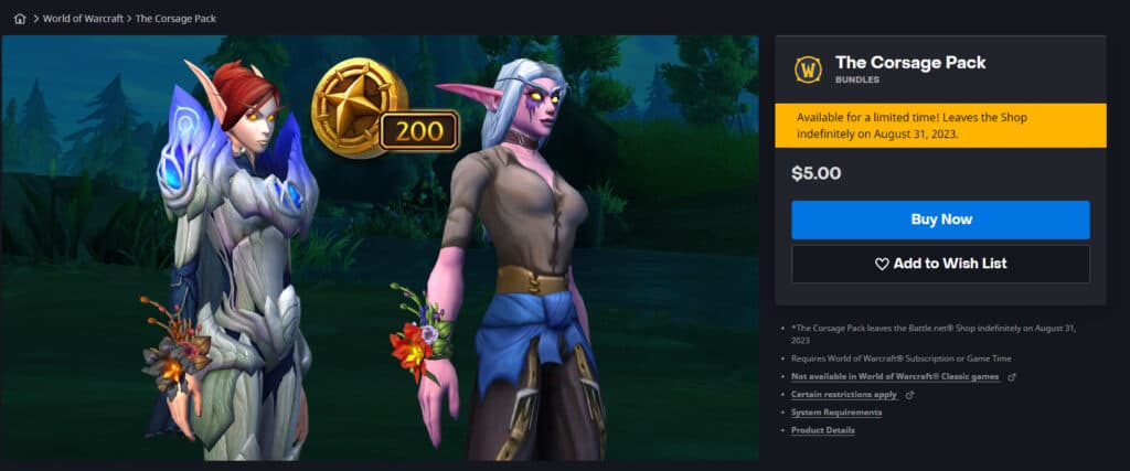 It appears that World of Warcraft creeps ever-closer to some semblance of a free-to-play MMORPG. Revealed today on the Blizzard store was a somewhat innocuous bundle for two transmog items. The 'Corsage Pack' contains two transmog items for $5.00 USD. However, the more interesting pack-in for this bundle is that it also includes 200 World of Warcraft Trader's Tender, the currency used for the newly added Trading Post feature.