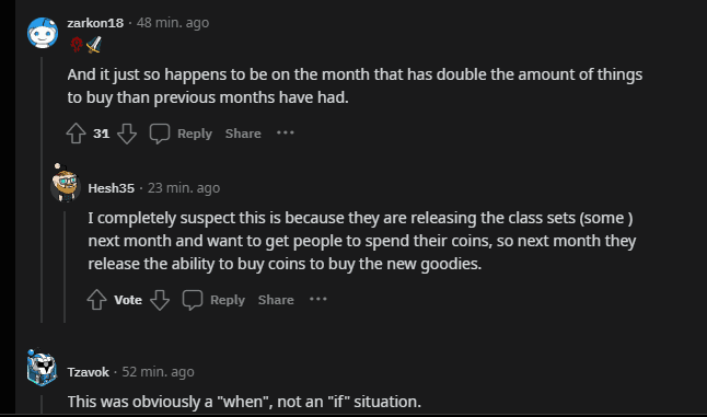 "'m not at all happy about this, but I'd understand more if they were a little bonus alongside something major," says Reddit user SystemofCells on the forum's post about the move. "Like, if every $25 mount you bought came with a couple hundred trader's tender. Still not great, but less predatory."