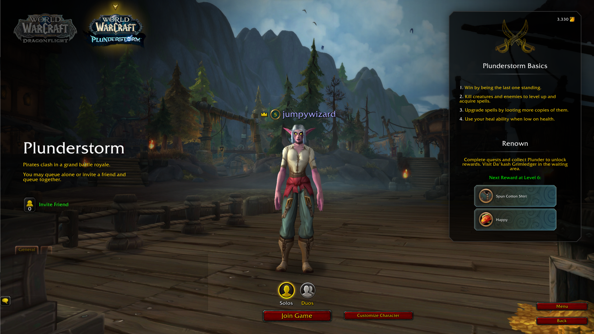 Taking place in the Arathi Highlands, WoW Plunderstorm is a mode accessed outside of the game game. You’ll load up World of Warcraft, then select Plunderstorm from the main menu. Likewise, created character remain unique to WoW Plunderstorm. From there, you’ll select to play in either a Solo or Duo team, much like other battle royale games.