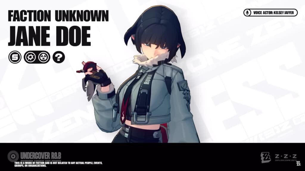 MiHoYo later revealed that Jane Doe is a mysterious Agent whose name and faction are unknown. She goes by Jane Doe, a name typically used as a placeholder and she introduces herself to New Eridu folks by different names. She doesn't have a faction on paper but is grouped with the Criminal Investigation Special Response Team of N.E.P.S.