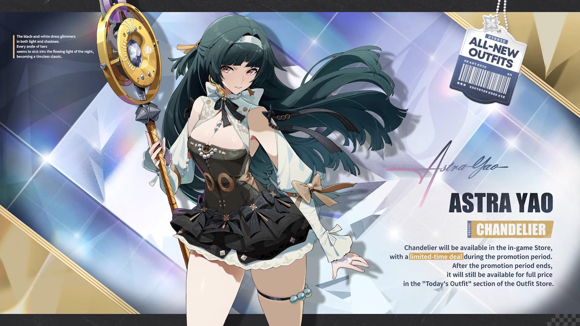 The newest S-rank Agent to ZZZ, Astra Yao, is also getting a skin! This alternate outfit for her completely departs from the red in exchange for a dark, intricate corset tube dress. The white remains in her outfit to accentuate the dark colors of her dress and hair.
