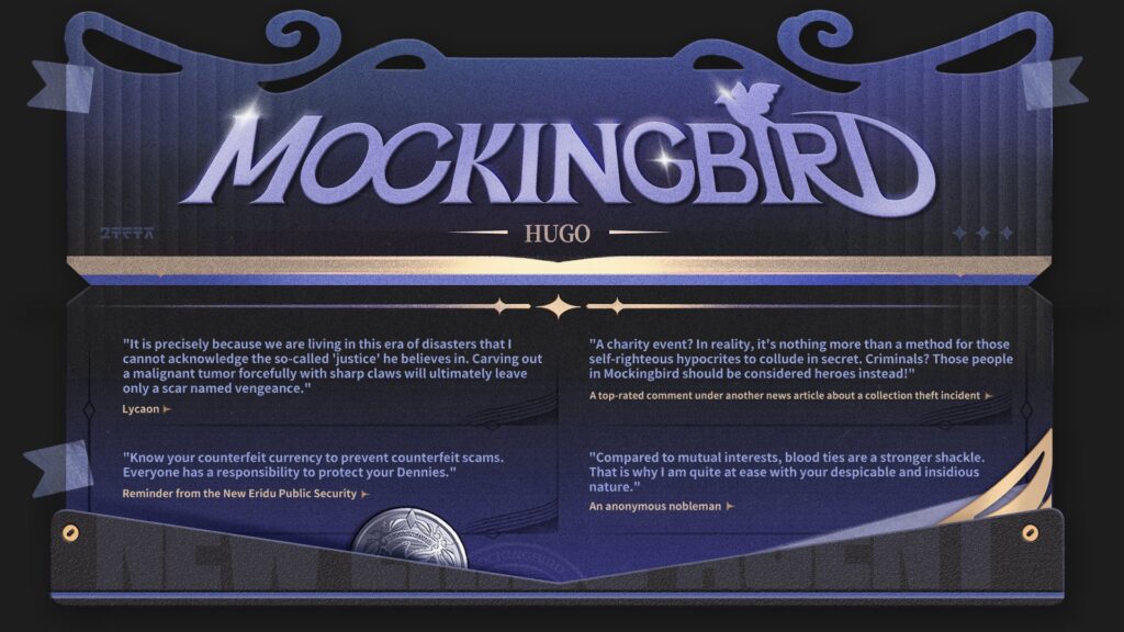 The other quotes are suggestive of Hugo’s duplicitous nature – a quality that he uses to its full effect. One anonymous nobleman points out Hugo’s “despicable and insidious nature” after implying that he has a blood tie with him, meaning that Hugo himself is a noble. He also seems to have a strong sense of justice, as supported by Lycaon’s statement and a certain “top-rated comment on Inter-Knot” that seems to be posted by Hugo himself under a post reporting his crimes.