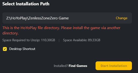 To start pre-downloading Zenless Zone Zero, click on “Get Game”. You’ll receive a prompt that’ll ask you to confirm installation address. Select your preferred folders and paths for the installation. Make sure that you have more than 110 GB of storage for a smooth ZZZ installation process. Click on “Start Installation”.