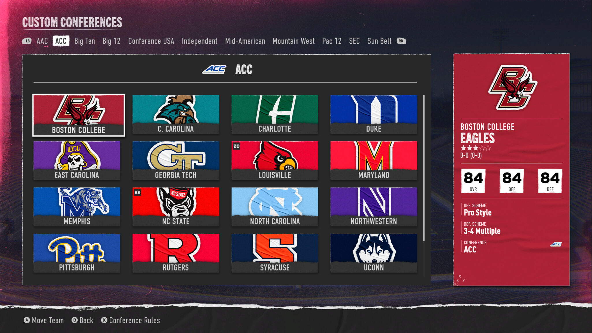 - ACC – 20-team catch-all conference generally located on the East Coast. I wanted to see what a really large conference would feel like.