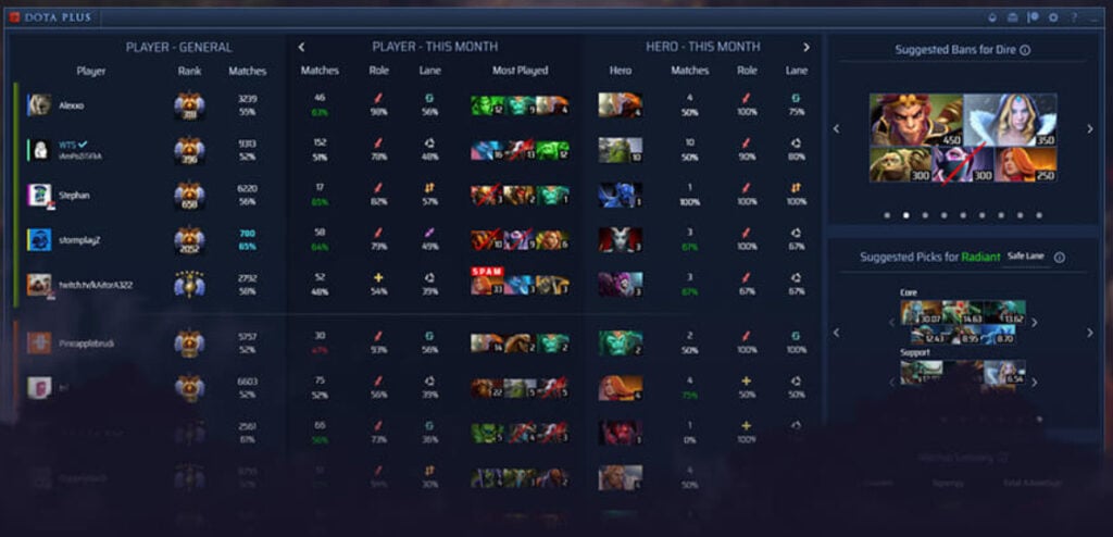 Valve clearly approves of all the features in the official Dota Plus, but Overwolf’s version provides services that are borderline cheating. During the draft, it scans accounts on the enemy team to suggest bans based on their recent match history. In addition, it can identify players who are spamming a particular hero in matchmaking so you can ban it.