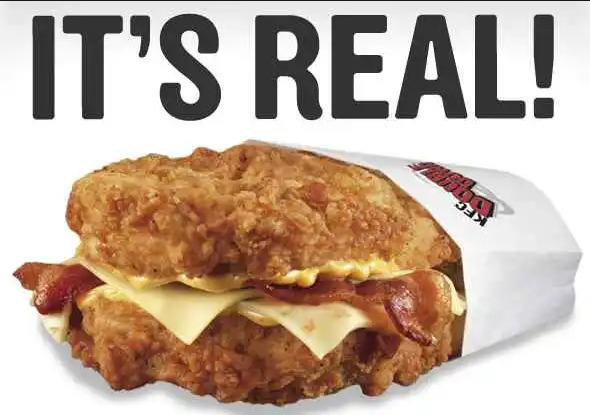 Needing a boost in the fast food wars, KFC was inspired by a food hoax as their next big thing. A half-rumor, half-joke on the internet began circulating about a sandwich from the chain featuring two fried chicken breasts as buns. In late 2009 the Double Down appeared in two test markets before vanishing once more.