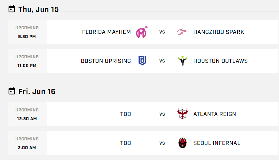 Four teams from the West Division will travel to Korea, meeting two East Division titans. The Florida Mayhem, Boston Uprising, Houston Outlaws, and Atlanta Reign will join the Seoul Infernal and Hangzhou Spark to decide which team reigns in Spring. In the case of Atlanta and Seoul, those teams have earned byes in the first round of this double-elimination bracket.