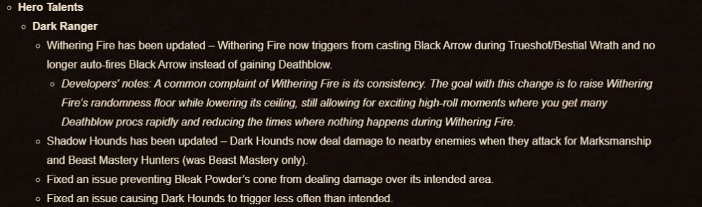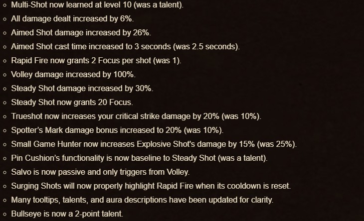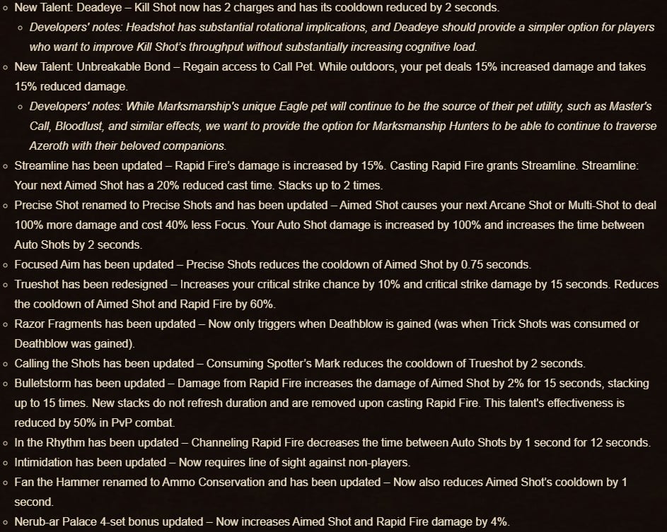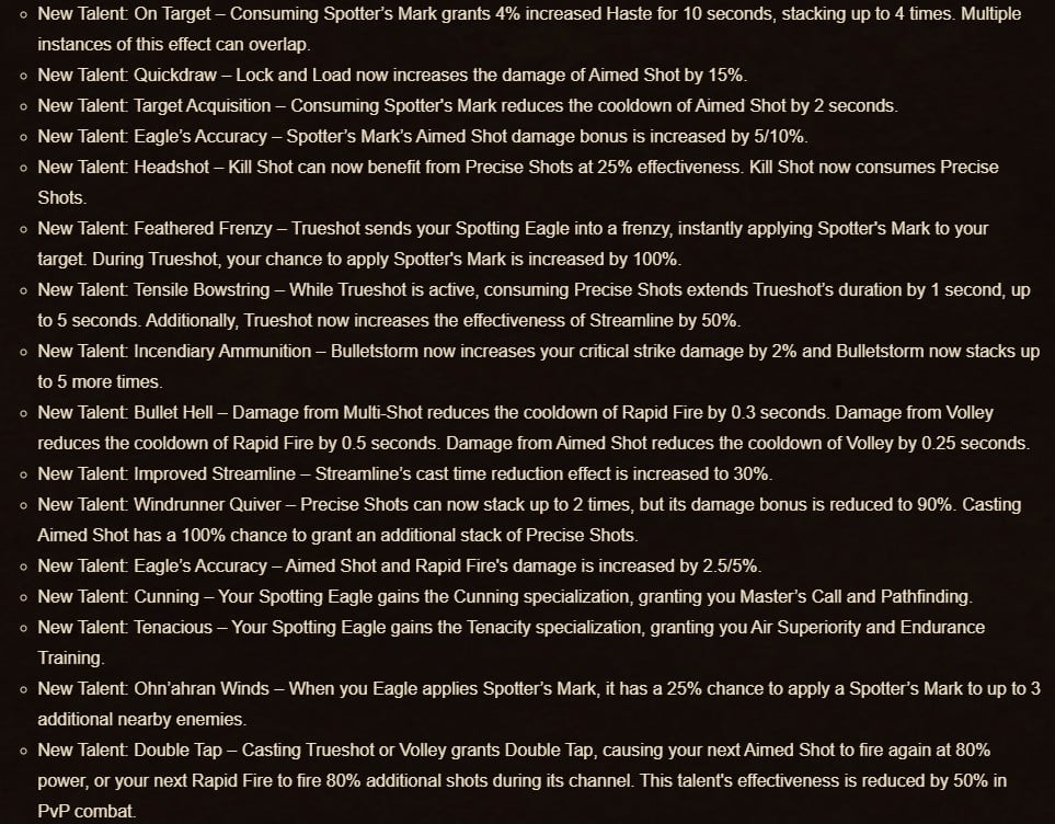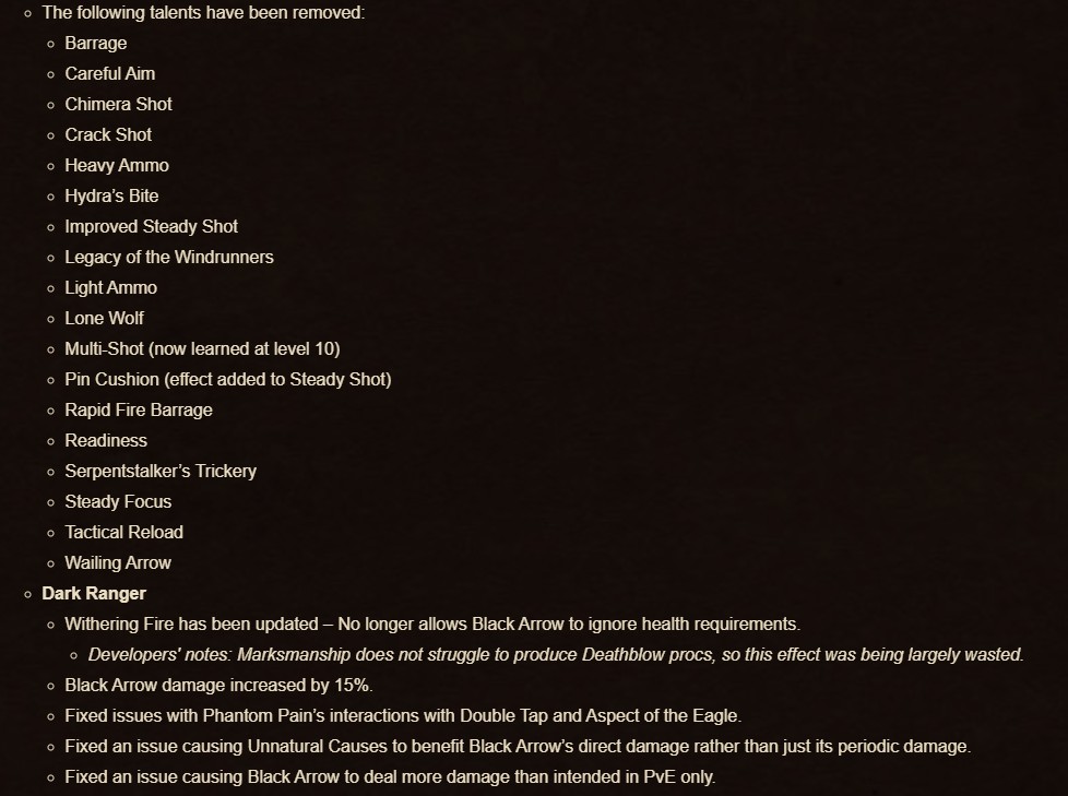 For the Marksmanship (MM) Hunter players, there have been numerous changes to the Dark Ranger and Sentinel trees, while some skills such as Streamline have been… well, streamlined. In their developer notes, Blizzard added that they were trying to reimagine the sharpshooter fantasy, which MM Hunters play around. To do this, pets are no longer a thing for the specialization (unless talented).