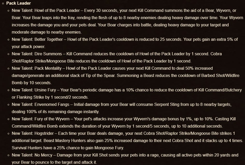 For Beast Mastery (BM), there are a lot of changes, too. With the Pack Leader tree revamped, the class can go forth in their own “beastlord” fantasy playstyle. The class will be able to summon a plethora of pets to go forth and wreak havoc, including a bear, wyvern, and boar – akin to Rexxar, one of the most famous Warcraft Hunters.